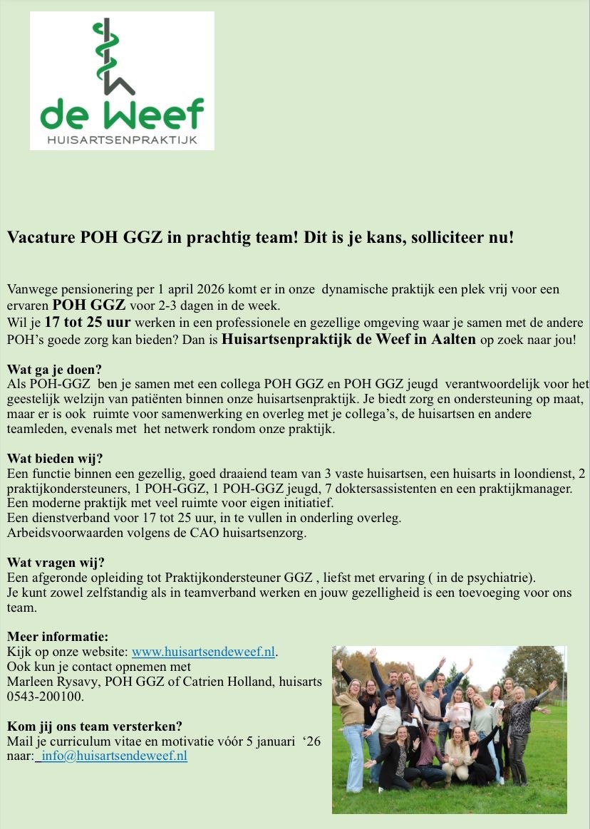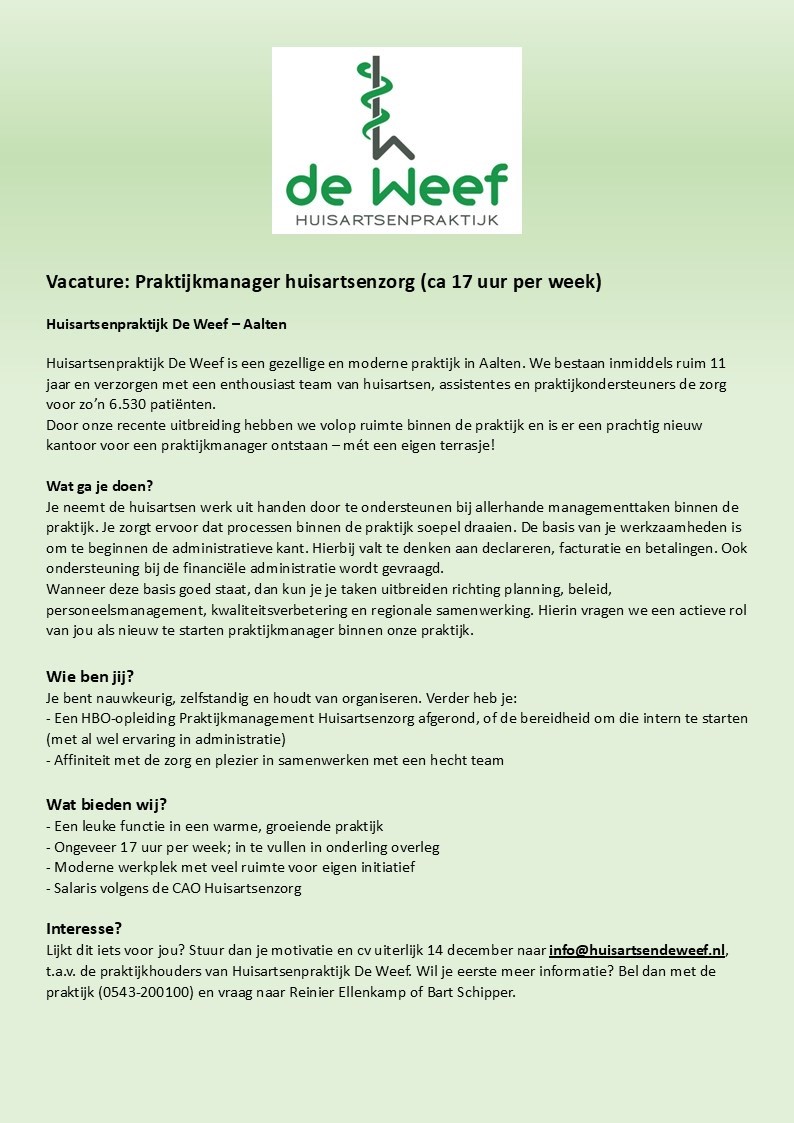 September 2025: Wij hebben een vacature voor de functie van praktijkmanager voor 1.5 tot 2 dagen per week. De vereiste hiervoor is een op HBO afgeronde opleiding tot praktijkmanager. De opleiding via ons volgen is bespreekbaar. Bij interesse: graag contact zoeken met de praktijk.